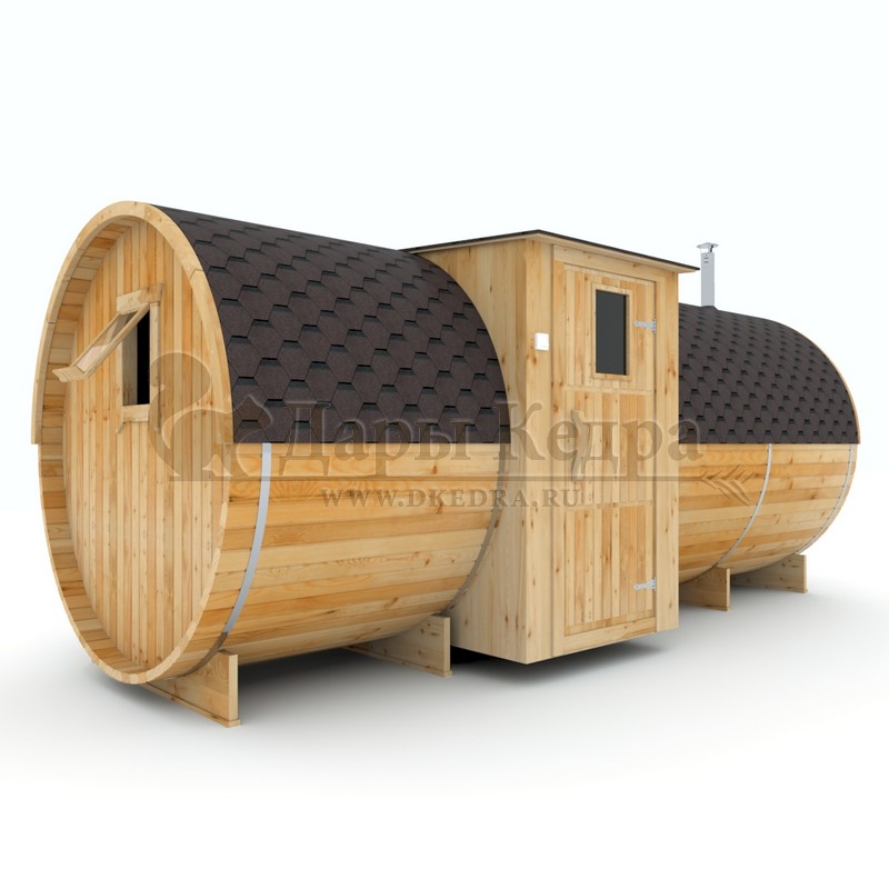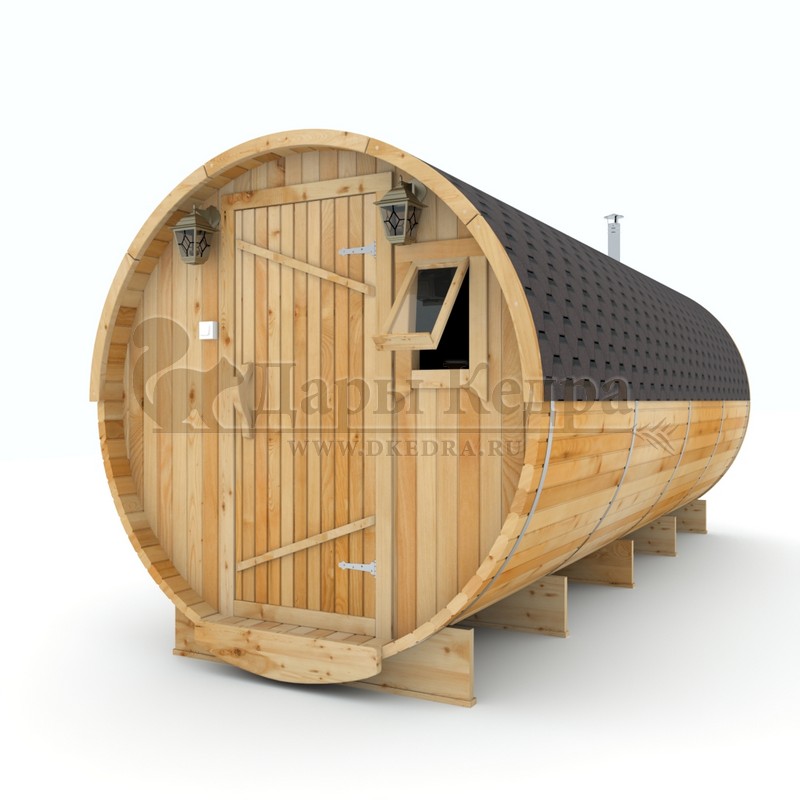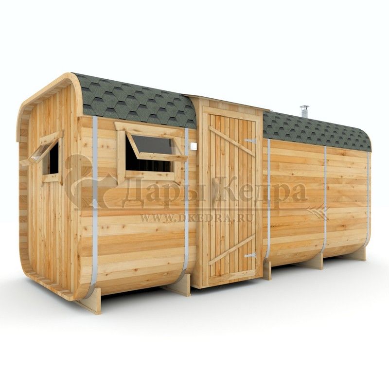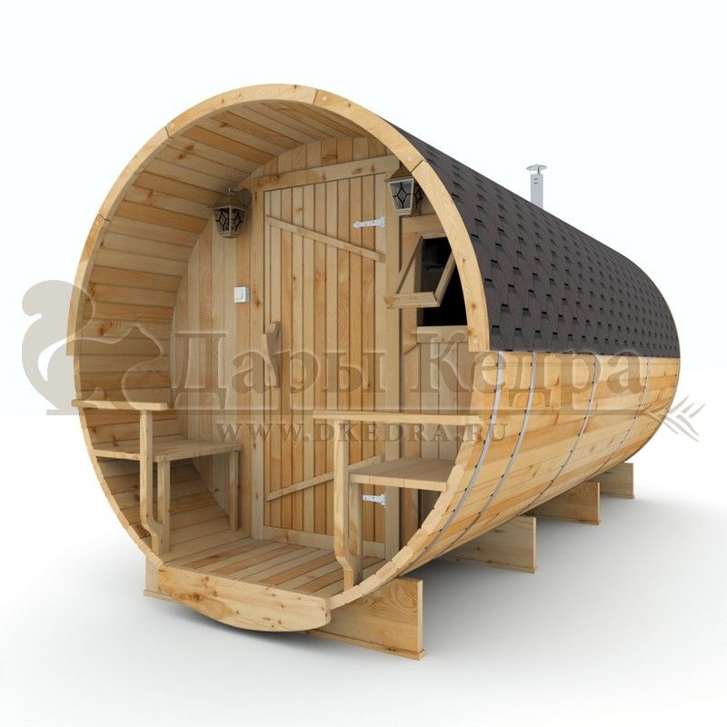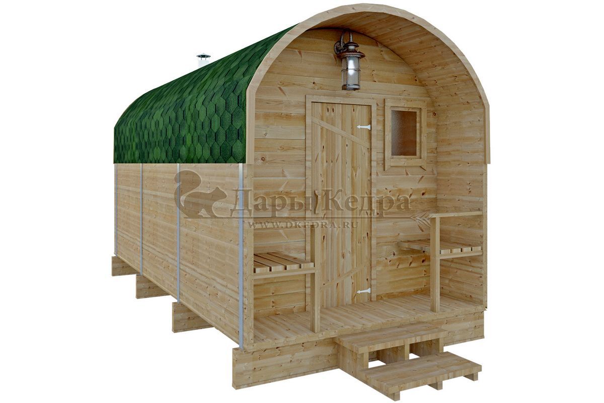 Баня-бочка буханка из кедра с козырьком (все размеры) Баня-буханка более просторная за счет увеличенной высоты потолков и ровного пола. Козырек не только украшает баню, но и защищает оставленную обувь от дождя. Лавочки из кедра находятся по всей длине бани-бочки с обеих сторон. Печь расположена в парилке около дальней стены. Время растопки такой бани не превышает 30 минут. В зависимости от выбранного размера баня-бочка буханка с козырьком имеет следующую комплектацию: Баня-бочка буханка 2,5 метра - парилка; Баня-бочка буханка 3,5 и 4,5 метра - раздевалка, парилка; Баня-бочка буханка 5,5 метров - раздевалка, парилка, моечная. По вашему желанию ее можно укомплектовать печью с внешней загрузкой, благодаря которой весь мусор вовремя топки остается на улице. Баня-бочка буханка не требует полноценный фундамент, поэтому при необходимости ее можно перенести в другое место. Обращаем Ваше внимание, что в стандартную комплектацию бани входят полки открытого типа в парной с обеих сторон. Дополнительно можно заказать полок закрытого типа или лавку! Кедр обладает ароматическими свойствами. Он не деформируется и влагоустойчив, при правильном уходе за деревом на нем не развиваются грибки и плесень.