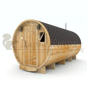 Это изделие круглой вытянутой формы с тремя отделениями: раздевалкой, моечной и парной. Во всех трех отделениях с обеих сторон установлены лавочки из кедра. Печь находится в парилке около дальней стены. Для удобства пользования в бане висят полочки из кедра и вешалка в раздевалке. Время растопки такой бани не превышает 30 минут. По вашему желанию баню-бочку можно дополнить печью с внешней загрузкой, благодаря которой весь мусор после топки останется на улице. Круглая баня-бочка не требует полноценный фундамент, поэтому при необходимости ее можно перенести в другое место.