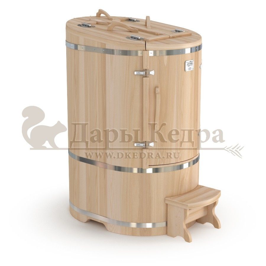 Кедровая бочка (фитобочка) овальная со скосом «Классическая» Овальная фитобочка из кедра - это мини парная, которую можно использовать не только в спа-салонах, но и дома. Овальная модель более просторна и удобна в использовании. Толщина стенок составляет 25 мм. Верхний скос делает положение головы более комфортным и улучшает обзор. Она оборудована откидными створками, дверцей и отверстием для головы. Во время парения человек сидит внутри кедровой бочки, а голова находится снаружи. Благодаря этому исключается возможность перегрева. Подлокотники из кедра, встроенные ручки на створках и двери делают эксплуатацию более удобной. Парение в фитобочке благотворно влияет на организм в целом: повышается иммунитет, выводятся шлаки и токсины, улучшается работа органов тела и состояние кожи.