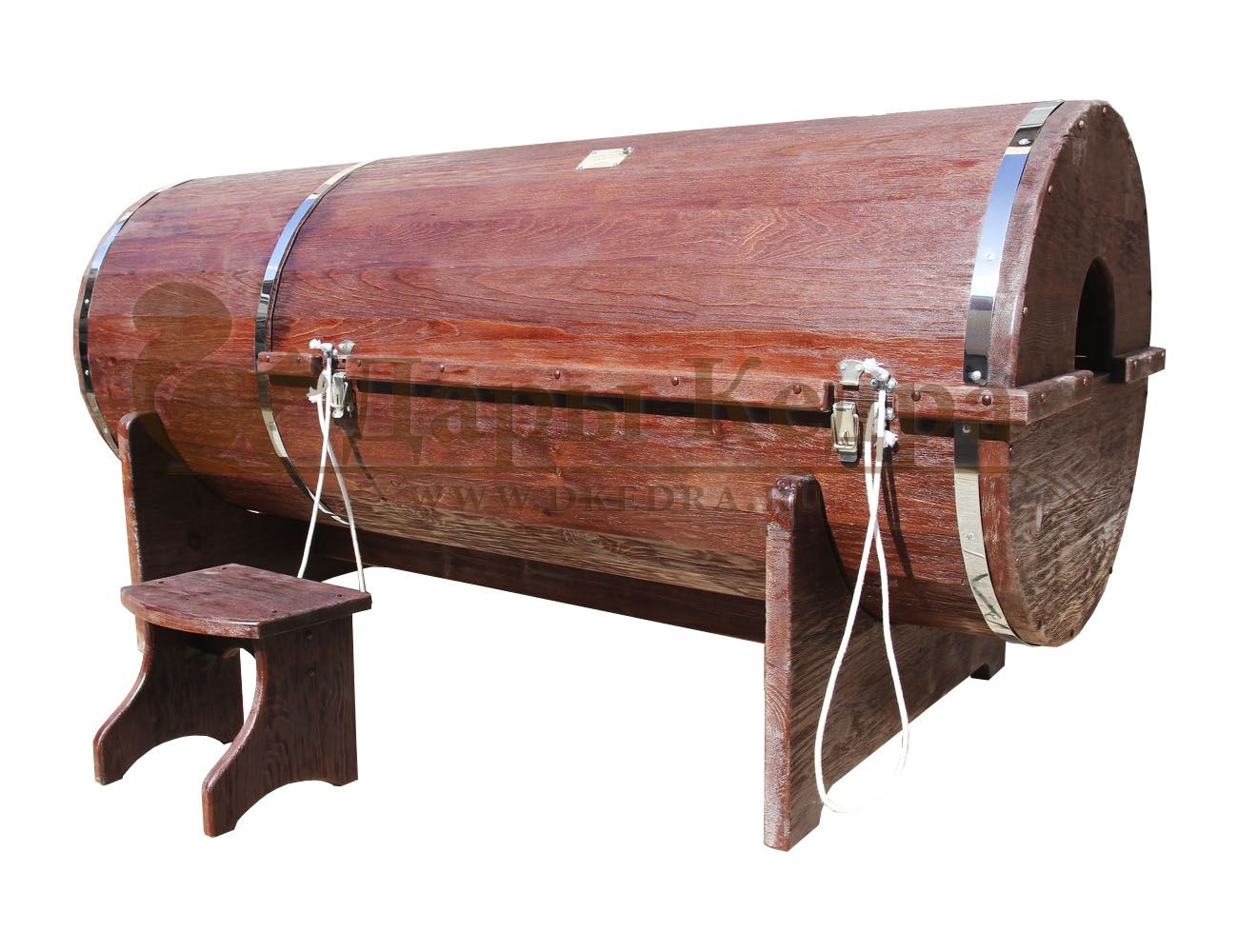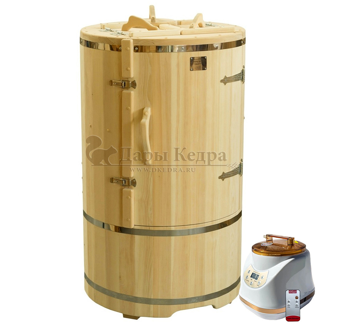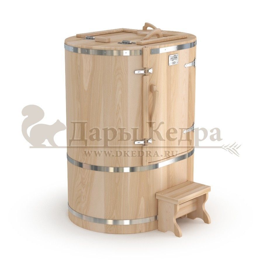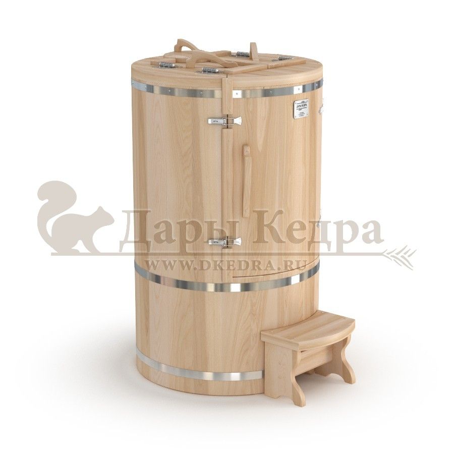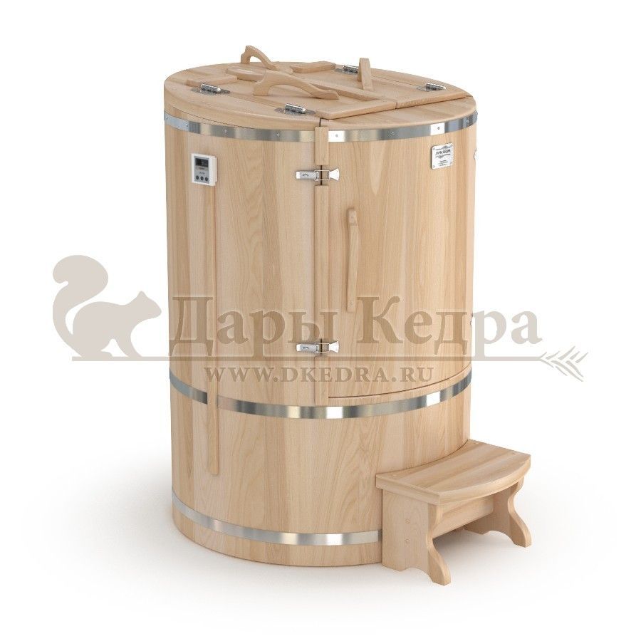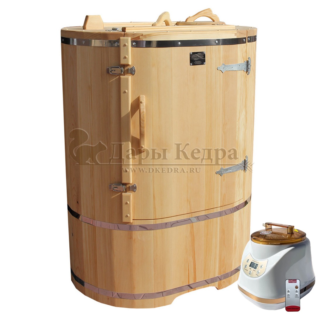 Готовый комплект «Удобный+»: кедровая бочка с парогенератором + био-защита изнутри и снаружи Готовый комплект - это полностью укомплектованный набор с фитобочкой для процедур парения. Овальная модель более просторна и удобна в использовании. Толщина стенок составляет 25 мм. Бочка оборудована откидными створками, дверцей и отверстием для головы. Верхний скос изделия делает положение головы более комфортным и улучшает обзор. Во время парения человек сидит внутри кедровой бочки, а голова находится снаружи. Благодаря этому исключается возможность перегрева. Подлокотники из кедра, встроенные ручки на створках и двери делают эксплуатацию более удобной. Парение в фитобочке благотворно влияет на организм в целом: повышается иммунитет, выводятся шлаки и токсины, улучшается работа органов тела и состояние кожи.